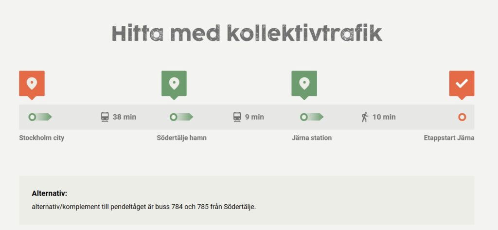 För att göra det ännu enklare för alla vandrare som planerar att använda kollektivtrafik på Sörmlandsleden, påminner vi från kansliet om att vi under texten på etappbeskrivningarna även inkluderar en bild med förslag på resvägar med kollektivtrafik på de ställen vi fått info om bra alternativ.