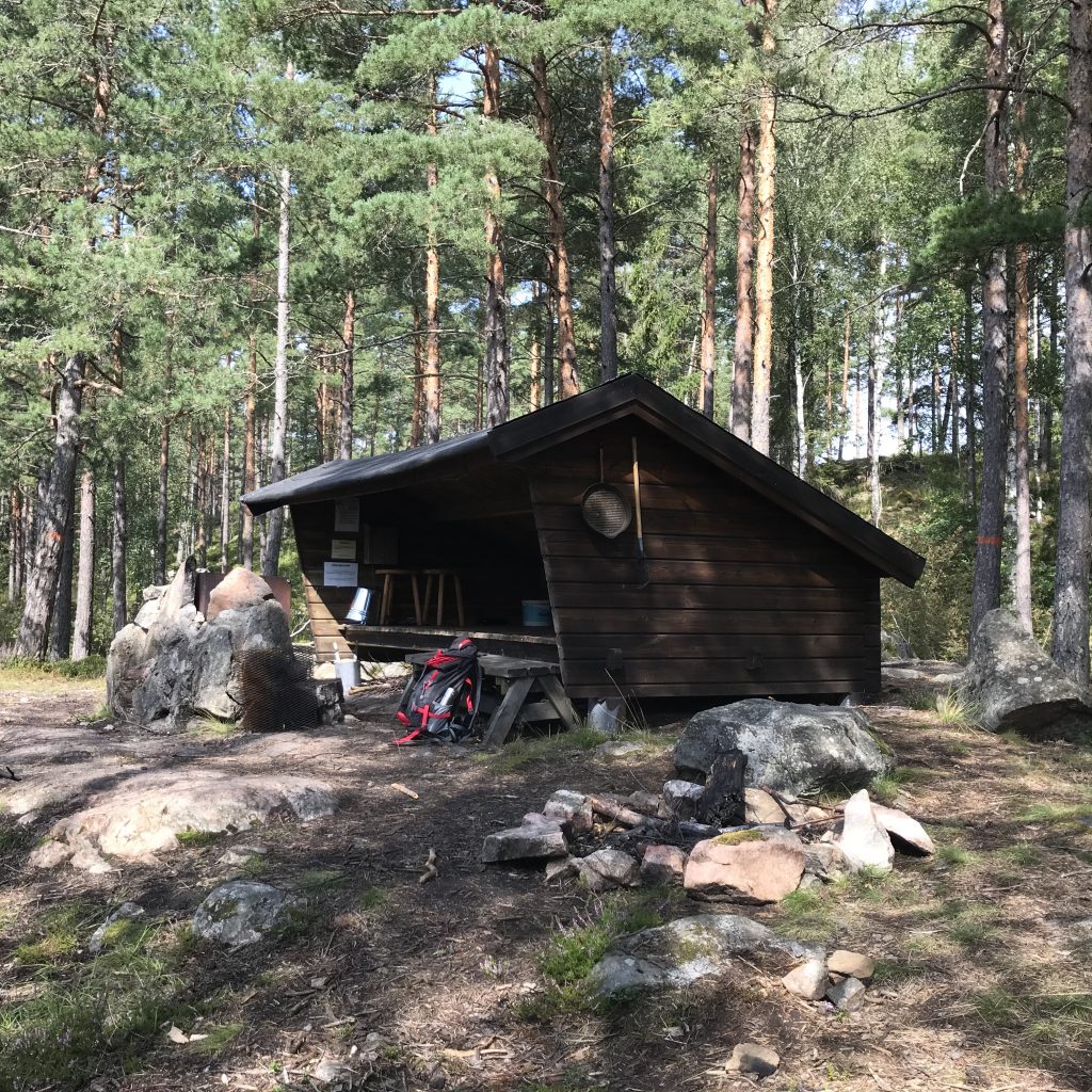 Bilden visar hur ett vindskydd på Sörmlandsleden kan se ut. Detta exempel är från Masugnsjön, etapp 48.
