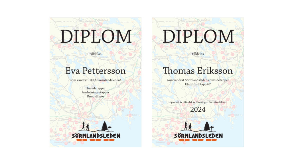 Långvandrardiplom: Det finns ingen tidsbegränsning, allt ifrån 10 dagar till flera decennier har förekommit bland de som hittills har erhållit diplomet. Du för själv anteckningar över vilka etapper du går. När du vandrat alla Sörmlandsledens 62 huvudetapper (eller HELA leden) meddelar du kansliet så får du ett diplom. Vi vill ha ditt namn och adress så skickar vi en personlig inbjudan till årsmötet i mars, då utdelningen av diplomen sker. Närvarar du inte så postas diplomen i efterhand.