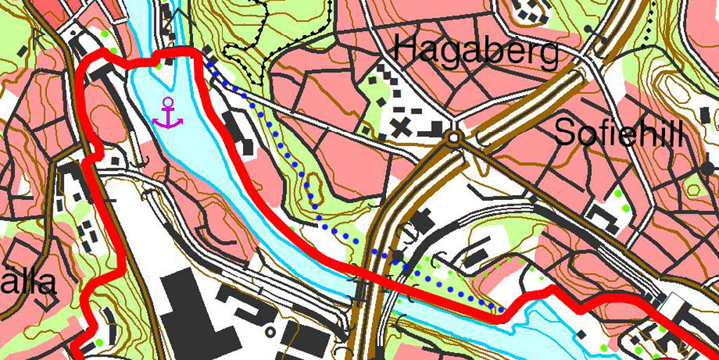 Tillfällig omdragning av etappen tills vidare. Snitslad markering med rött band och lite kuperat genom skog. Blåprickad på kompletterande karta.